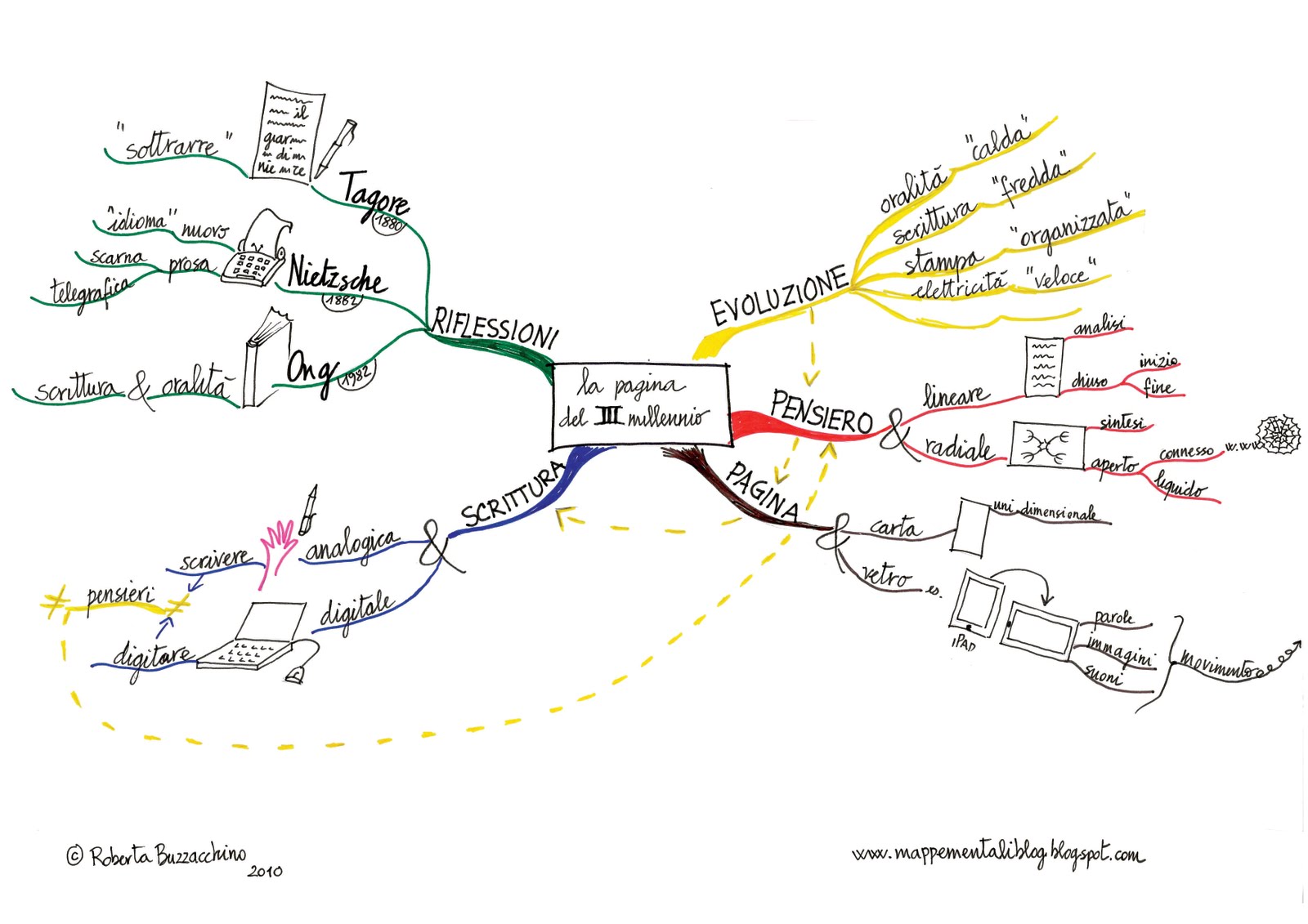 Passare dalla scrittura lineare a quella radiale vuol dire utilizzare lo spazio in modo nuovo: girare il foglio da verticale a orizzontale; non scrivere da sinistra verso destra, ma partire dal centro e proseguire in senso orario; non utilizzare la gabbia per l’impaginazione, ma tracciare una struttura analoga a quella dei neuroni; non scrivere sulle righe, ma sui rami; non scrivere frasi, ma parole chiave e immagini; utlilizzare non solo il nero ma tutti i colori che l’immaginazione suggerisce.