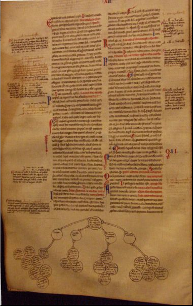 (…) intrigante è la presenza non occasionale di raffinate mappe mentali, generalmente tracciate nel margine inferiore, di mano diversa da quella del copista e da quella del redattore delle glosse a margine del testo, che alla narratività, pur sintetica, delle glosse giustappongono l’evidenza grafica di argomentazioni scandite in una struttura a volte piramidale a volte radiale utili per prevenire o colmare le lacune della memoria (…)