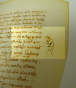 Nel libro Trasformation of Knowledge, Early manuscripts from the collection of Lawrence J. Schoenberg (2006, Paul Holberton Publishing, London), ho trovato un fist in un codice del XIII secolo (il fist dovrebbe essere successivo, perché, nonostante sia una riproduzione, inchiostro e mano sono apparentemente diversi). Il codice, del XIII secolo, contiene la Metafisica di Aristotele tradotta da William di Moerbeke: