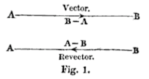 Lo vediamo in questa seconda figura [Fig. 2] tratta da Elements of Quaternions [2] che rappresenta lo stesso concetto. Il libro in questione è successivo e il vettore non è ancora rappresentato nel modo a noi familiare, bensì la freccia è “incorporata” nel segmento. In questo libro l’autore (o il tipografo) è stato costretto a disegnare due figure separate.